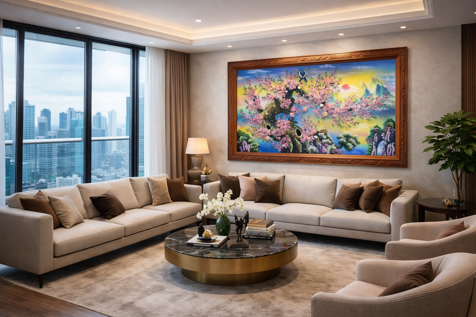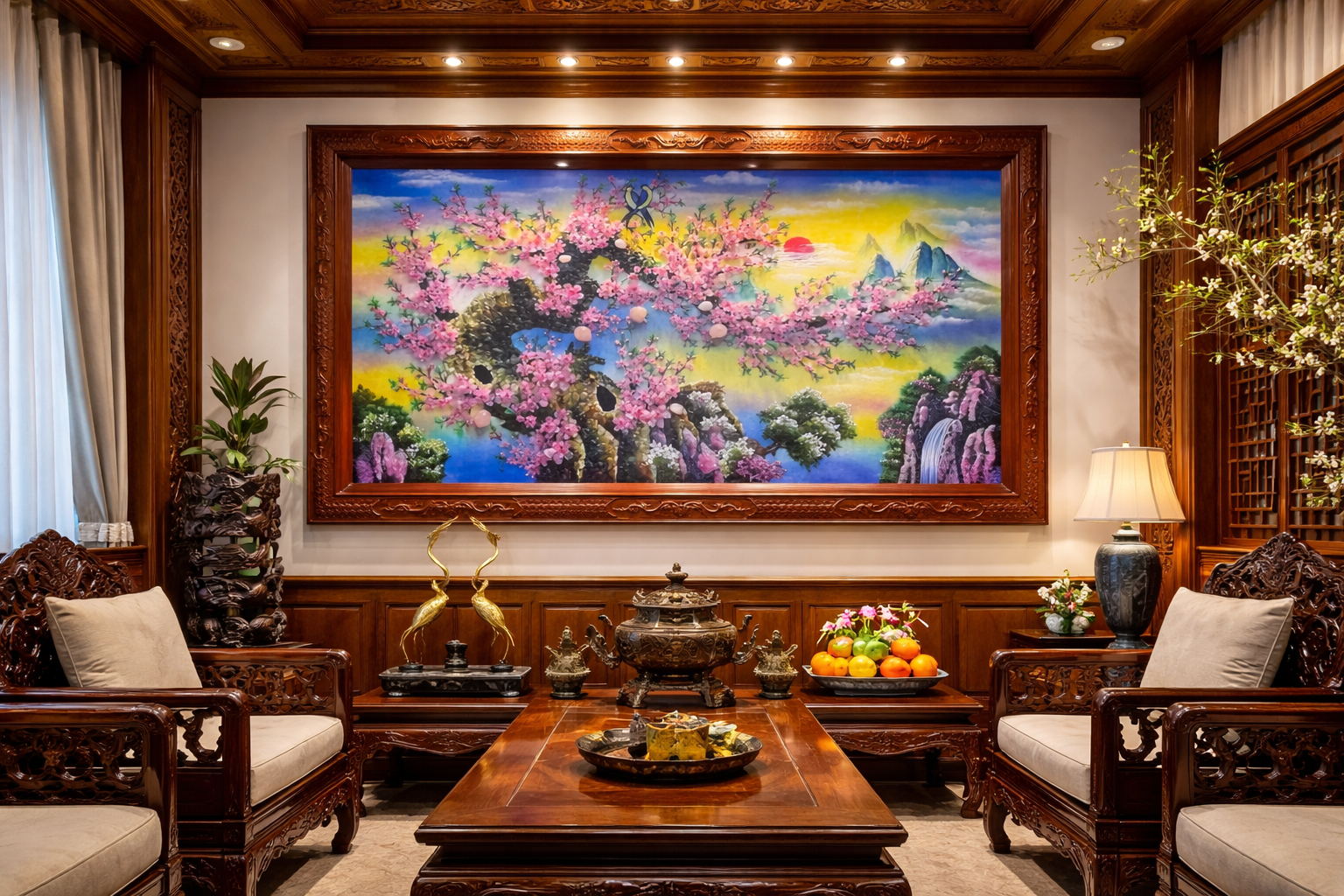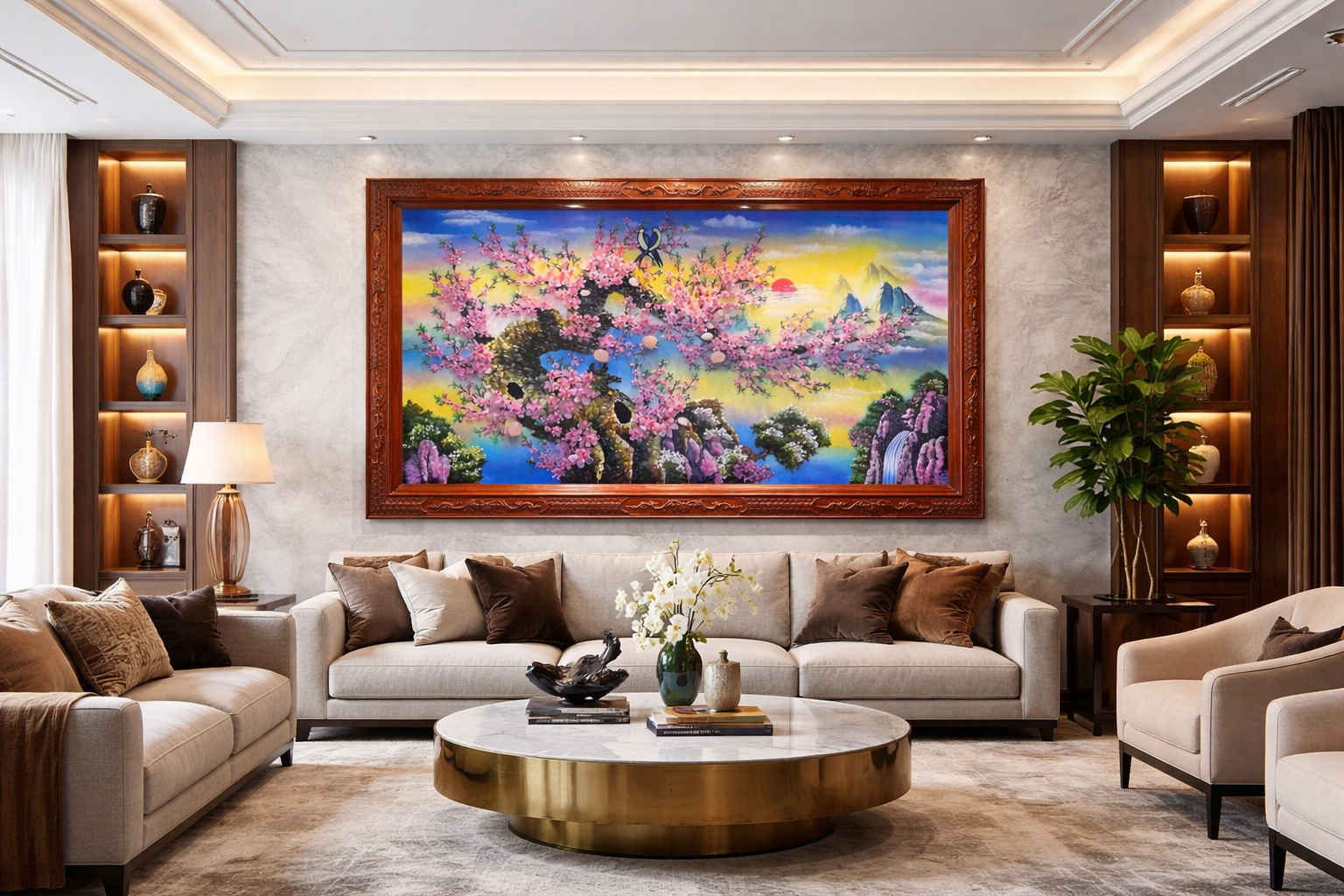 Phòng khách là vị trí lý tưởng để treo tranh đá quý hoa đào. Bức tranh lớn sẽ tạo điểm nhấn nghệ thuật và giúp không gian trở nên sang trọng và ấn tượng hơn.
